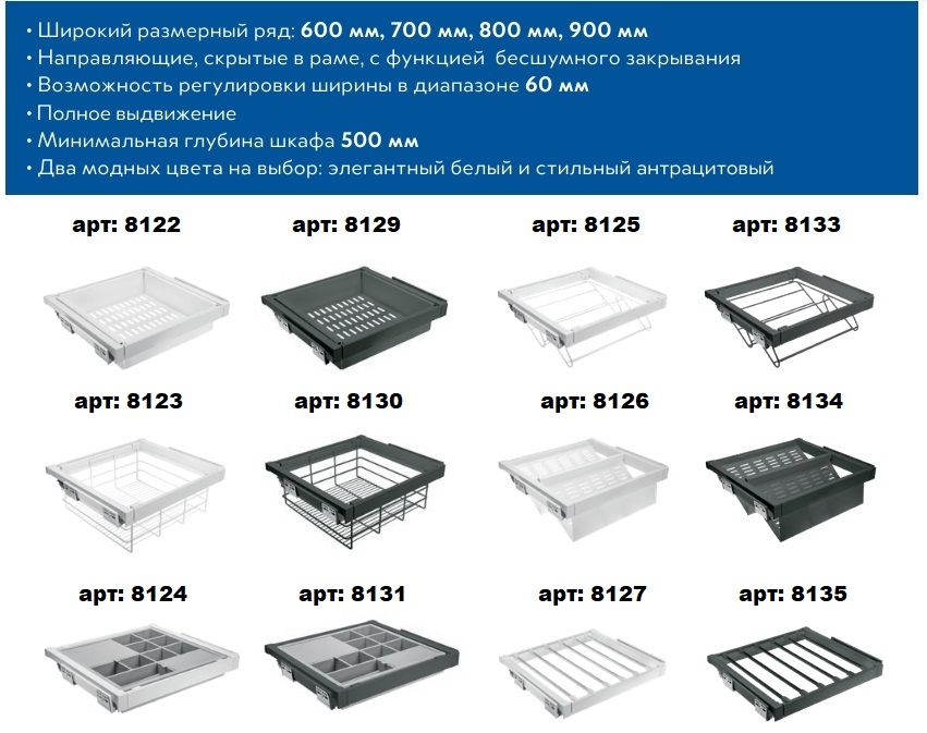 Практичные корзины Выдвижные ящики с тремя видами корзин по выбору: металлическая, плетеная и ажурная. Все ящики оснащены механизмом бесшумного закрытия и функцией полного выдвижения, которые гарантируют удобство в ежедневном использовании.