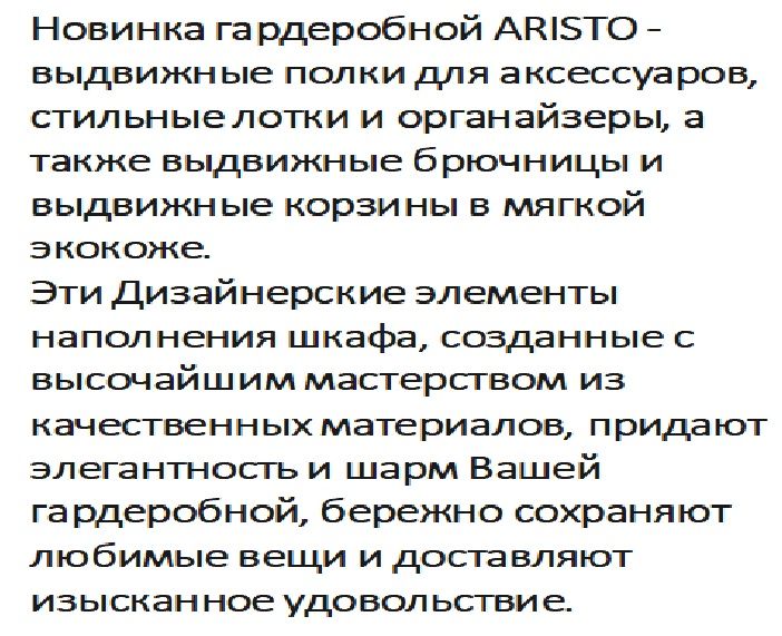 новинка Добавить в избранное Убрать из избранного Артикул: 8337 Артикул: 8337 Вешалка для брюк выдвижная 664х469х65 металл Черный, рейка Серый FC0470.VP066.BK0PC.CN ARISTO * 12 468 ₽ В корзину Купить в 1 клик В корзину Купить в 1 клик ВОЗМОЖНО ВАС ЗАИНТЕРЕСУЕТДобавить в избранноеУбрать из избранногоРассеиватель для полки с подстветкой черный МАТОВЫЙ L=2.7м DE0251.AP270.BKM00.CS ARISTO 766 ₽В корзинуДобавить в избранноеУбрать из избранногохитПрофиль для полки с подсветкой ЧЁРНЫЙ МАТОВЫЙ L=...мм DE0559.VP540.BKSPC.CJ ARISTO 828 ₽ПараметрыДобавить в избранноеУбрать из избранногохитПрофиль-крышка для полки с подсветкой ЧЁРНЫЙ МАТОВЫЙ L=....мм DE0558.VP540.BKSPC.CJ ARISTO 442 ₽ПараметрыДобавить в избранноеУбрать из избранногохитУголки сборочные для полки с подстветкой ЧЁРНЫЙ МАТОВЫЙ компл 4шт DE0253.VS000.BKSPC.CN ARISTO 658 ₽В корзину
